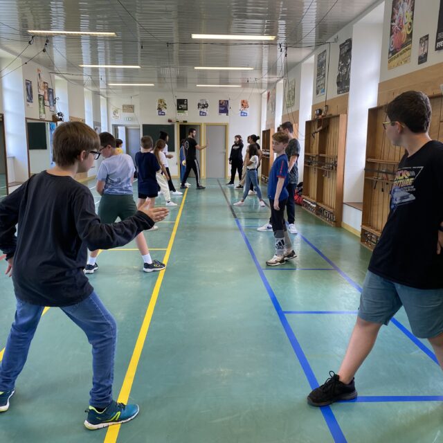 Une heure d’escrime, sous la direction du maître d’armes du Club de Morlaix, dans l’enceinte du club d’escrime (face au lycée Notre Dame du Mur Le Porsmeur).
